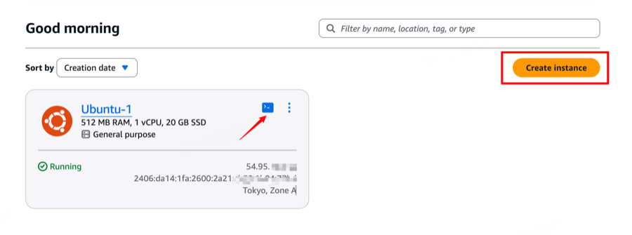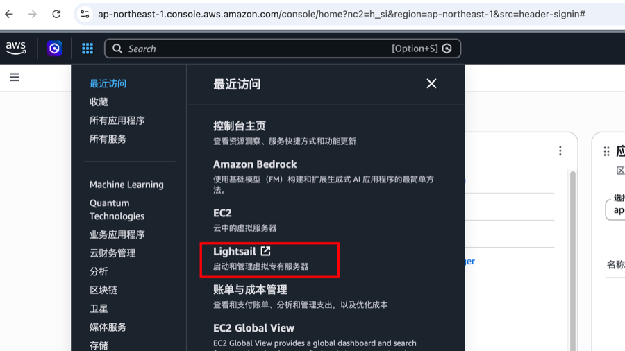 进入 Lightsail 控制台,选择最便宜的套餐($3.5 ~ $5/月),推荐选择东京节点,延迟更低。