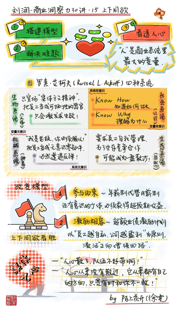 罗素·艾柯夫提出,这个世界上有四套系统:机械系统、生物系统、生态系统,和社会系统。社会系统,是唯一一个系统(比如公司)和变量(比如员工)都有意识的系统。这是你第一次用系统动力学分析“集体”中的“个体”:是人心散了吗?队伍不好带了吗?人心从来没有散过。它从来都有自己的方向,只是有时和你不一致。管理人心的“根本解”,是改变模型,实现“上下同欲”。