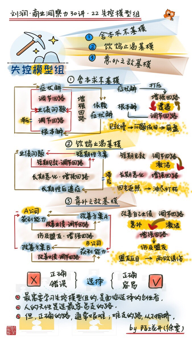 - 失控模型组(Out of Control):包含了舍本逐末、饮鸩止渴、意外之敌。“如果”期待中的调节回路,遭遇意外的增强回路,“就”会情况失控;
