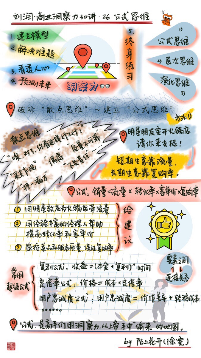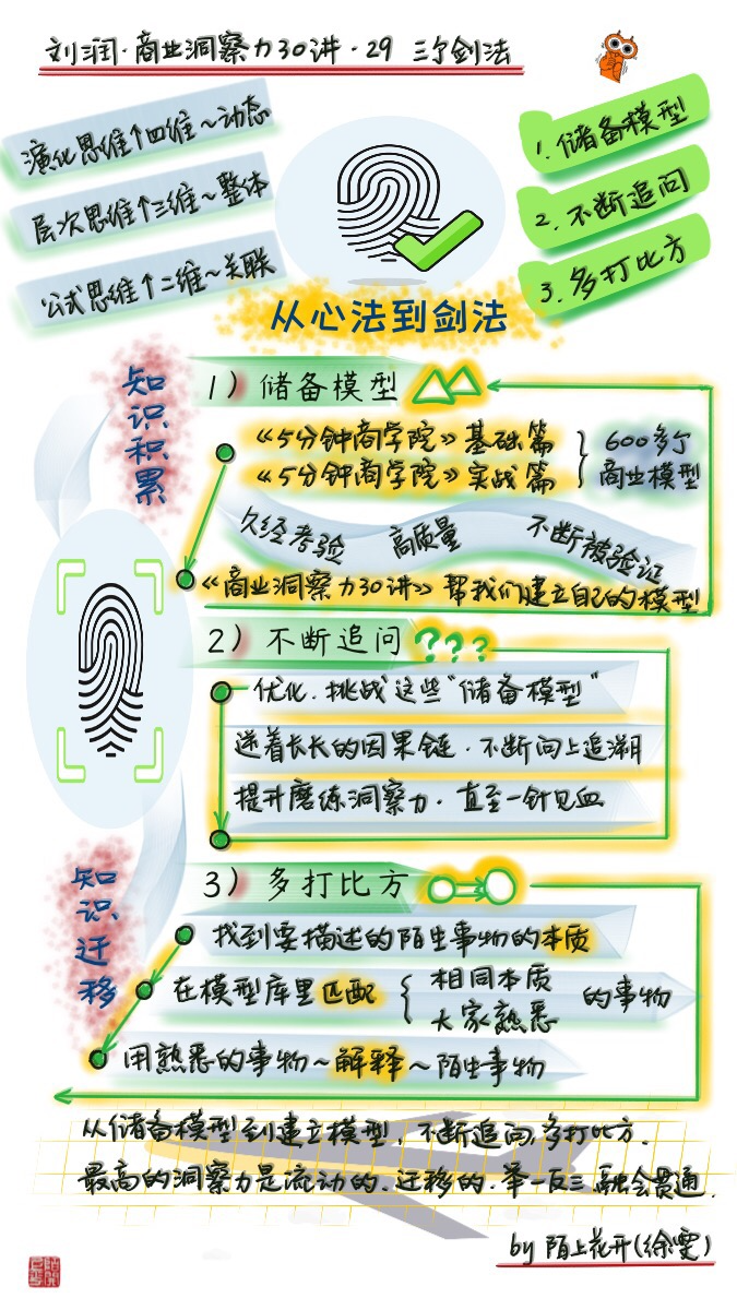 公式思维、层次思维、演化思维,是终身练习洞察力的心法;储备模型,不断追问,和多打比方,是终身练习洞察力的剑法。